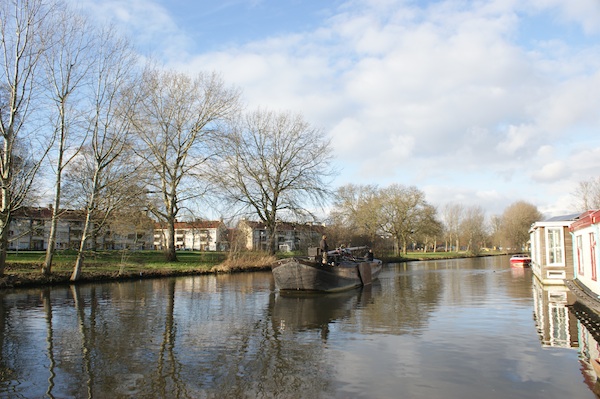 De hele dag is het een komen en gaan van duwboten. Op de anders in het winterseizoen zo rustige Vecht is het nu een gezellige drukte. Ze varen in een kalm tempo en veroorzaken zo geen overlast.