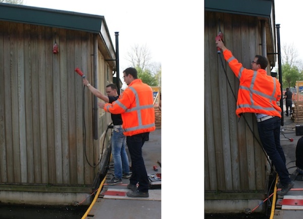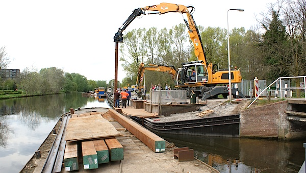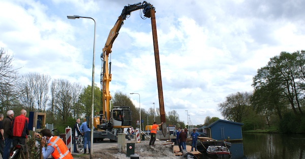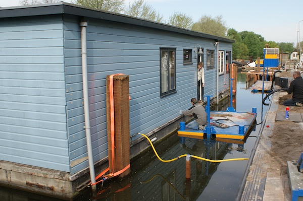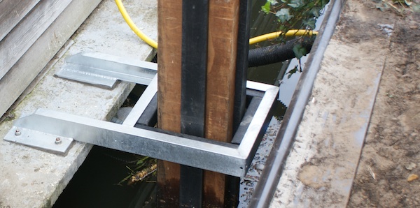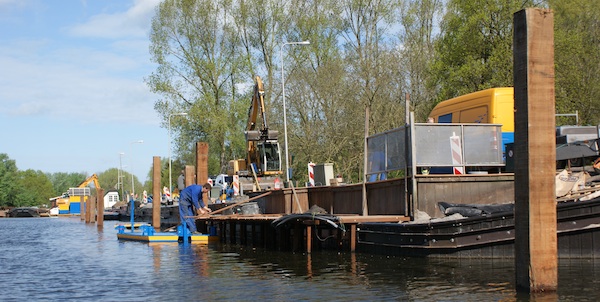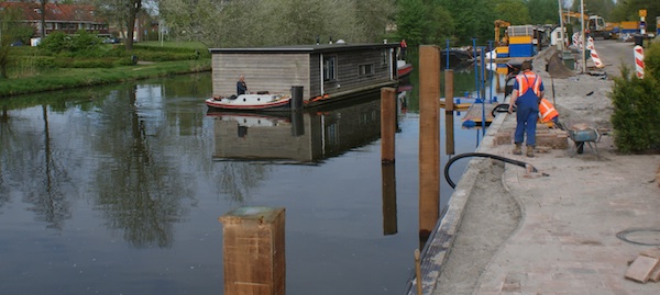 Bij de eerste twee woonarken zijn de afmeerbeugels gemonteerd. LBM uit Almere bevestigde de beugels en de glijstrippen op de houten meerpalen.