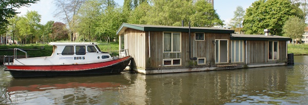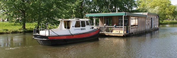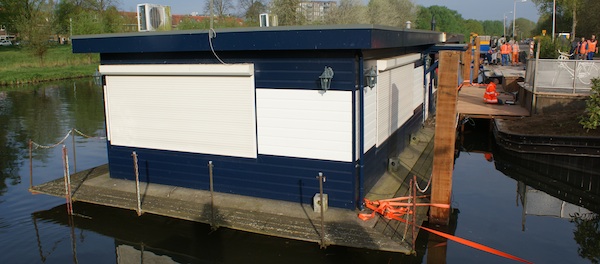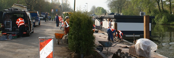 Vanmorgen werd de eerste woonark terug gesleept naar de oorspronkelijke ligplaats. Daar was meer “oranje” dan voorheen aanwezig, mannen van aannemer Scholman en installateur Vonk die hard werken aan de herinrichting van de oevers.