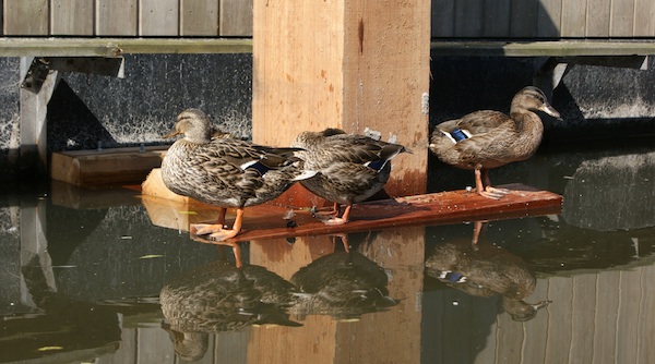 Als woonboten terug gaan naar hun oorspronkelijke ligplaatsen, kunnen ze nog niet direct met de definitieve beugels aan de palen afgemeerd worden. Afgelopen week werden houten constructies gemaakt waarmee tijdelijk de woonboten tegen de meerpalen afgemeerd kunnen worden. De drijvende voorzieningen functioneren goed en blijken multifunctioneel te zijn. Bedankt, ook namens de gevederde Vechtbewoners.