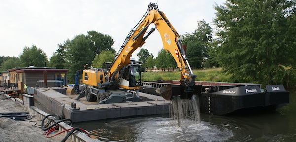 Een overslagkraan (waarmee ook bomen verwijderd zijn en de meerpalen geplaatst zijn) werd op een ponton geplaatst en naar de lege ligplaatsen gevaren. Na het instellen van het GPS-systeem kon gestart worden met baggeren op de ligplaats van 326, op de plaats waar Van der Lee de laatste werkzaamheden verricht had.