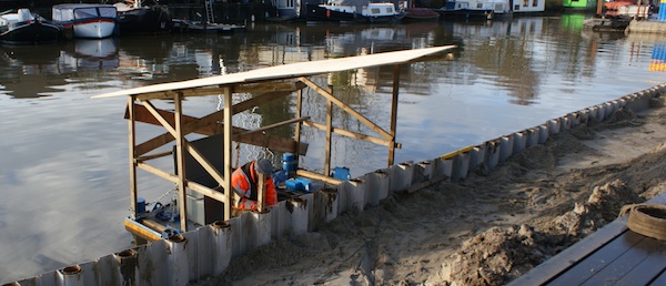 Geheel los van het project was er iets opmerkelijks aan de hand, het was een bijzondere dag voor de woonark van Vechtdijk 362. Blijkbaar was het tijd voor een nieuw jasje. Niet vanwege de kou, maar om ervoor te zorgen dat periodiek werfbezoek met de stalen ark voortaan niet meer nodig is.