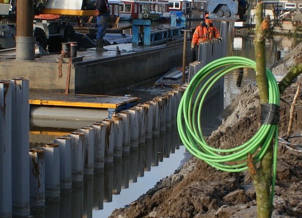 Vanaf het water worden met een speciale boormachine gaten geboord in de stalen gordingen. Om mens en machine te beschermen tegen de weersinvloeden werd op een ponton een afdak gebouwd.